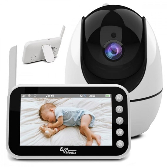 Wielofunkcyjna, bezprzewodowa niania elektronicza Promedix PR-805. Lekki, przenośny odbiornik pozwala nie tylko na monitorowania pokoju dziecięcego, ale również na kontrolę temperatury, uruchomienie jednej z 8 dostępnych kołysanek, lub komunikację za pomocą funkcji interkomu. Duży, kolorowy wyświetlacz 4,5-calowy ekran IPS wyświetla obraz w rozdzielczości 480x800 pikseli. Tryb nocny Kamera wyposażona jest w 8 podczerwonych diod LED o wysokiej intensywności, które rejestrują wyraźne obrazy w ciemności. Kiedy wbudowany czujnik wykryje, że oświetlenie otoczenia jest słabe, podczerwone światło LED automatycznie się włączy, a wyświetlacz odbiornika będzie dostępny w wersji czarno-białej z wyświetloną ikonką statusu trybu nocnego na górze ekranu. Nagrywanie na kartę pamięci Umieszczenie w urządzeniu karty pamięci (brak w zestawie) pozwoli na nagrywanie obrazu w jakości HD 1280x720p. Zawartość karty można przeglądać na komputerze lub innym kompatybilnym urządzeniu. Funkcja interkomu - dwustronna komunikacja Urządzenie przekazuje dźwięk w obie strony, co pozwala rodzicom na zdalną rozmowę z dzieckiem.