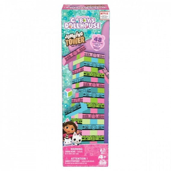 Przygotuj się. To rodzinna gra w układanie klocków, którą pokochasz. Zbuduj wieżę, ale uważaj, żeby nie jej nie przewrócić, bo to oznacza przegraną w tej grze dla dzieci Koci Domek Gabi Wieża od Spin Master Games. Cel gry jest prosty - nie dopuścić do przewrócenia wieży. Graj z kimś we dwójkę lub nawet z całą grupą. Wygrywa ten gracz, który jako ostatni wyjął klocek z wieży, nie przewracając jej przy tym. Ta gra dla dzieci ma 48 drewnianych elementów w kolorze niebieskim, różowym i zielonym z ikonami Kociego Domku. Ta gra dla dziewczynek i chłopców zawiera ulubione kotki, w tym Kiciusia Pandusia i Łakotka. Jeśli twoje dzieci nigdy nie mają dość zabawek z serii Koci Domek Gabi, wypróbuj tę zabawną grę. Aby zagrać, rzuć kością, aby ustalić kolor i wyjmij klocek w tym kolorze z dowolnego miejsca na wieży, z wyjątkiem najwyższego poziomu. Po wyjęciu klocka umieść go na szczycie wieży we właściwym kierunku. Gracze wykonują ruchy na zmianę, dopóki któryś z nich nie przewróci wieży. Podczas wyjmowania i umieszczania klocków w trakcie gry można używać tylko jednej ręki. Możesz dotknąć klocka, aby sprawdzić, czy jest luźny. Jeśli przesuniesz go podczas sprawdzania, ale nie będziesz go przenosić, umieść klocek w pierwotnym położeniu. Kup już dziś grę Koci Domek Gabi Wieża dla dzieci od Spin Master Games na rodzinny wieczór z grami.