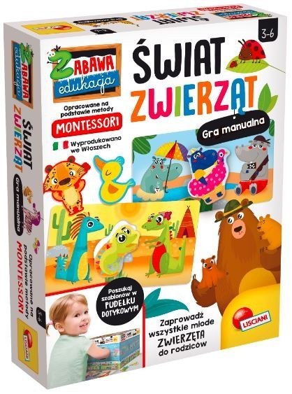 Świetna gra z mnóstwem szczęśliwych rodzin zwierząt! W unikatowym pudełku dotykowym, dziecko musi szukać zwierząt tylko za pomocą zmysłu dotyku oraz dopasować zwierzę do jego rodziny. Ta gra oparta na metodzie Montessori, polega na uczeniu się przez doświadczenie.