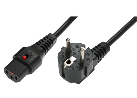 Przewód o długości 2m w kolorze czarnym, posiadający złącze kątowe Schuko oraz proste IEC C13, wyposażony w system blokujący IEC LOCK. Zastosowanie takiego przewodu zabezpiecza każde podłączone do niego urządzenie przed nagłą utratą zasilania w wyniku przypadkowego wypięcia, wibracji lub innych działań. Niewątpliwą zaletą systemu IEC LOCK jest jego uniwersalność, gdyż przewody lub wtyki z blokadą mogą być stosowane ze wszystkimi standardowymi gniazdami IEC. Zblokowanie następuje automatycznie po wpięciu przewodu, zaś jego odłączenie możliwe jest dopiero po zwolnieniu przycisku blokady. Przewód posiada uziemienie, co dodatkowo gwarantuje bezpieczeństwo podłączonych urządzeń.