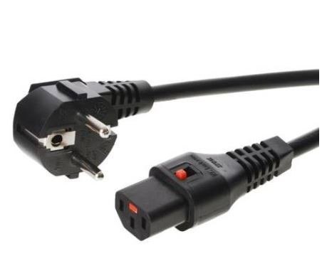 Przewód o długości 5m w kolorze czarnym, posiadający złącze kątowe Schuko oraz proste IEC C13, wyposażony w system blokujący IEC LOCK. Zastosowanie takiego przewodu zabezpiecza każde podłączone do niego urządzenie przed nagłą utratą zasilania w wyniku przypadkowego wypięcia, wibracji lub innych działań. Niewątpliwą zaletą systemu IEC LOCK jest jego uniwersalność, gdyż przewody lub wtyki z blokadą mogą być stosowane ze wszystkimi standardowymi gniazdami IEC. Zblokowanie następuje automatycznie po wpięciu przewodu, zaś jego odłączenie możliwe jest dopiero po zwolnieniu przycisku blokady. Przewód posiada uziemienie, co dodatkowo gwarantuje bezpieczeństwo podłączonych urządzeń.