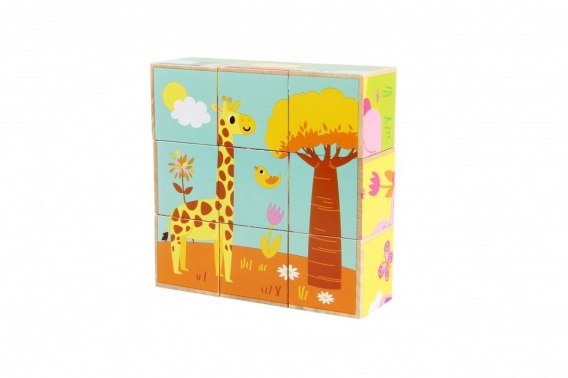 Drewniane klocki obrazkowe pomalowane bezpiecznymi, nietoksycznymi farbami wodnymi na piekne wyraziste kolory. Na każdej z 6 stron klocka znajduje się fragment wizerunku uroczego zwierzątka. Wyzwanie polega na takim ułożeniu klocków by zobaczyć cały obrazek. Dziewięć klocków razem aż sześć różnych obrazków. Wymiary klocków i ich ilość są precyzyjnie dopasowane do rączek dziecka w wieku powyżej 18 miesięcy. Doskonały pomysł na prezent. Wyjątkowa trwałość i uniwersalność zabawek drewnianych gwarantuje, że będa dawały dzieciom radość przez bardzo długi czas.