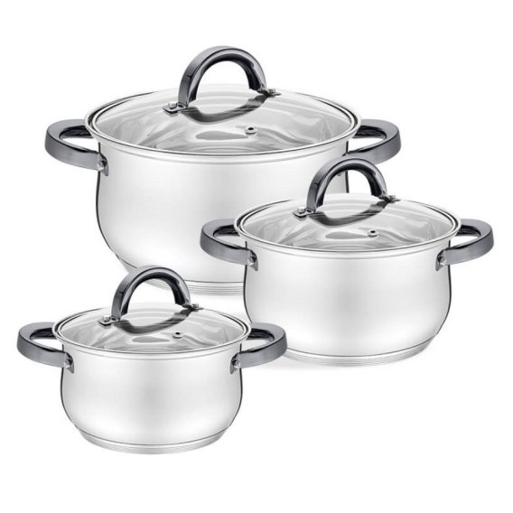 Kompletny zestaw garnków ze stali nierdzewnej, idealny do codziennego gotowania i serwowania na stole. Dzięki klasycznemu designowi w czarnych uchwytach, zestaw doskonale pasuje do każdej kuchni. Wytrzymałe materiały i praktyczne rozmiary pozwalają na przygotowanie różnorodnych potraw od sosów po zupy i dania jednogarnkowe.