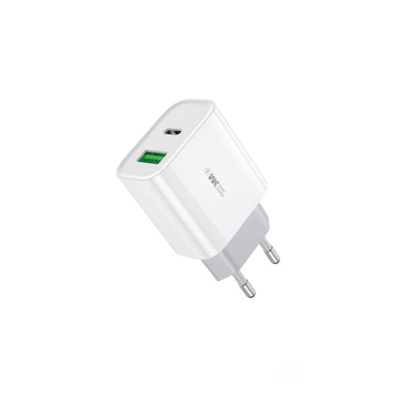 Szybka i niezawodna ładowarka sieciowa WEKOME WP-U53 Maxspeed wyposażona w port USB-C oraz USB-A o maksymalnej mocy wyjściowej 20W Power Delivery.