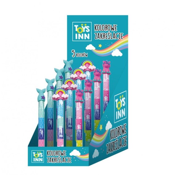 Markery 5w1, ułożone są jeden na drugim i zakończone kolorowymi końcówkami. Dzięki swym małym gabarytom, zawsze możemy mnieć je pod ręką. Sprawdzą się w szkole lub w domu, do zaznaczania ważnych informacji, jak i do zwykłego rysowania.