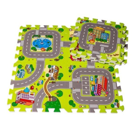 Mata piankowa to 9 puzzli o wymiarze 30 x 1 x 30 cm, które tworzą miasto z ulicami, szkołą, zoo, placem zabaw, fontanną i szpitalem. Dziecko może jeździć autkiem po ulicach i inscenizować różne scenki.