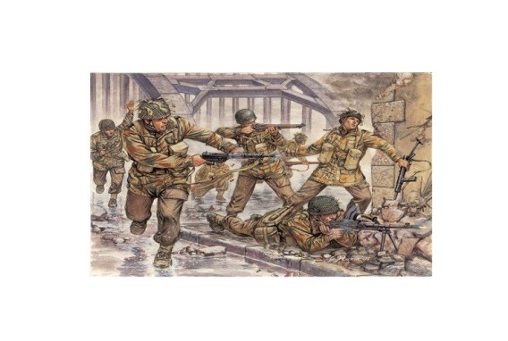 Zestaw zawiera 50 plastikowych figurek brytyjskich spadochroniarzy "Red Devils" do sklejania.