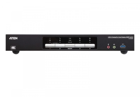 Przełącznik KVM ATEN CS1944DP do komputerów stacjonarnych ułatwia organizację pulpitu. Szczególnie w przypadku zarządzania multimedialną stacją roboczą w dużej organizacji CS1944DP zapewnia natychmiastowy dostęp do dwóch lub czterech komputerów, a wszystko to za pośrednictwem jednej klawiatury USB, myszy USB i dwóch monitorów DisplayPort.