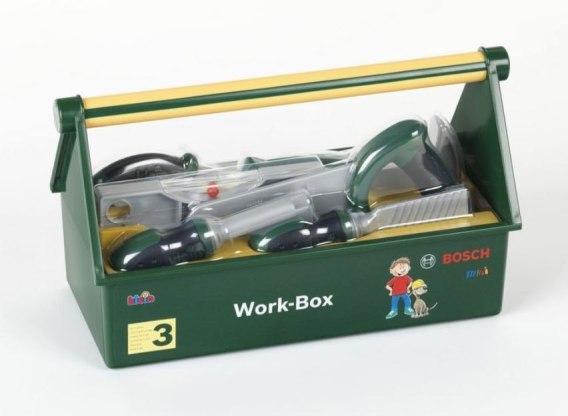 Wytrzymała skrzynka narzędziowa BOSCH z 7-częściowym zestawem narzędzi.