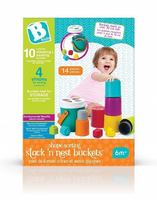 - Zestaw 8 kubków w różnych kolorach oraz wiaderko z nakładką - sorterem z otworami, przez które można wrzucać kolorowe klocki w geometrycznych kształtach.