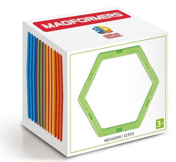 Produkt zawiera 12 kolorowych, magnetycznych klocków w kształcie sześciokątów. Elementy są kompatybilne z wszystkimi zestawami Magformers. Za pomocą figur geometrycznych można zbudować wspaniałe trójwymiarowe budowle, począwszy od prostych figur, skończywszy na pomysłowych budowlach. Magnetyczne klocki mogą być układane na płasko lub w przestrzeni.