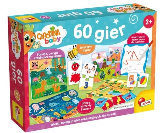 60 gier od Lisciani to wyjątkowa kolekcja gier edukacyjnych dla najmłodszych pozwalająca rozwinąć podstawowe kompetencje dziecka, takie jak dopasowywanie kształtów, umiejętność kojarzenia czy rysowanie pierwszych kształtów. Elementy dydaktyczne zestawu pozwalają na wykonywanie 60 różnych aktywności, w czym pomagają plansze ze środowiskami, gra pamięciowa, puzzle czy dwustronne tablice. Dzięki suchościeralnemu pisakowi dziecko może korzystać z gier dowolną ilość razy, po każdej próbie ścierając pozostałości pisaka z elementów specjalną gąbeczką. Dzięki zestawowi dziecko pozna zagadnienia związane z domem, lasem, morzem, farmą i sawanną co znacznie rozwinie jego znajomość zwierząt, owoców, warzyw czy przedmiotów codziennego użytku. Elementy zestawu są wykonane z trwałej tektury, a kształt i rozmiary elementów są dostosowane do dziecięcych rączek, dzięki czemu zabawa jest wygodna i łatwa.