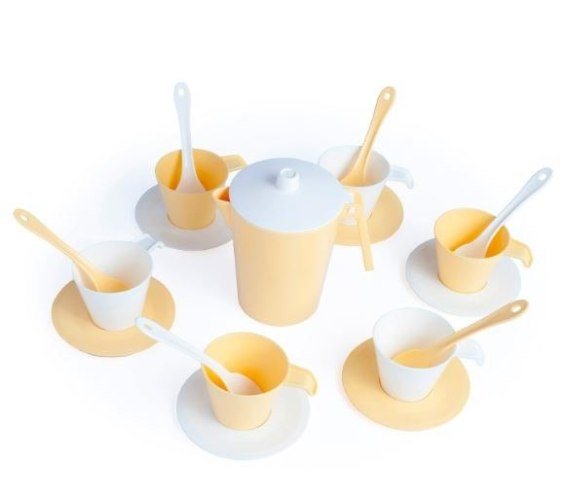 Serwis kawowy z serii Toys in Trends w kolorach żółto-biało-szarym, to niezastąpiona zabawka dla każdego dziecka, które lubi bawić się w odgrywanie ról. Idealnie nadaje się na kameralne spotkanie na herbatkę dla 6 osób, a mała gospodyni będzie mogła w zabawny sposób nauczyć się zasad etykiety i nakrycia stołu. Zestaw składa się z 19 elementów: dzbanka, 6 filiżanek, 6 talerzyków, 6 łyżeczek. Zestaw jest starannie wykończony i bezpieczny w użytkowaniu naczynia są dopuszczone do kontaktu z żywnością, można używać ich w kuchence mikrofalowej i myć w zmywarce.
