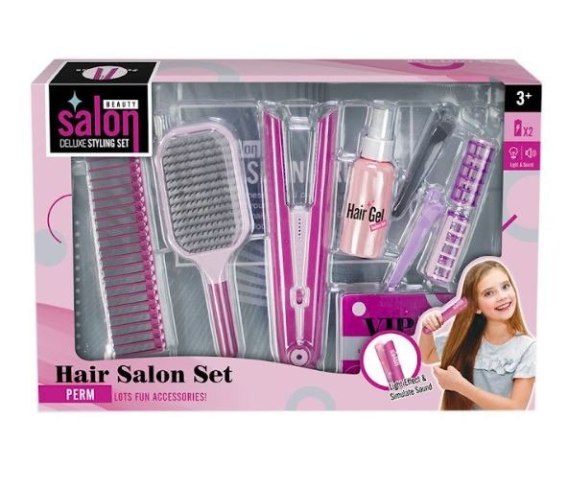 Zestaw składa się z prostownicy na baterie, szczotki, grzebienia, 2 wałków, 2 spinek, plastikowej buteleczki oraz karty VIP dla najlepszych klientek.
